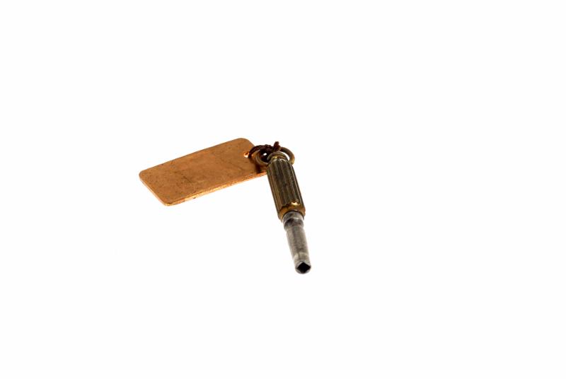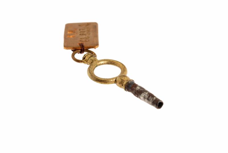2 urnycklar i stål med skaft/handtag i mässing. Den ena med cirkelformat handtag, den andra med långsmalt handtag med längsgående räfflor. Förvaras i dockbyrå KM 62819.