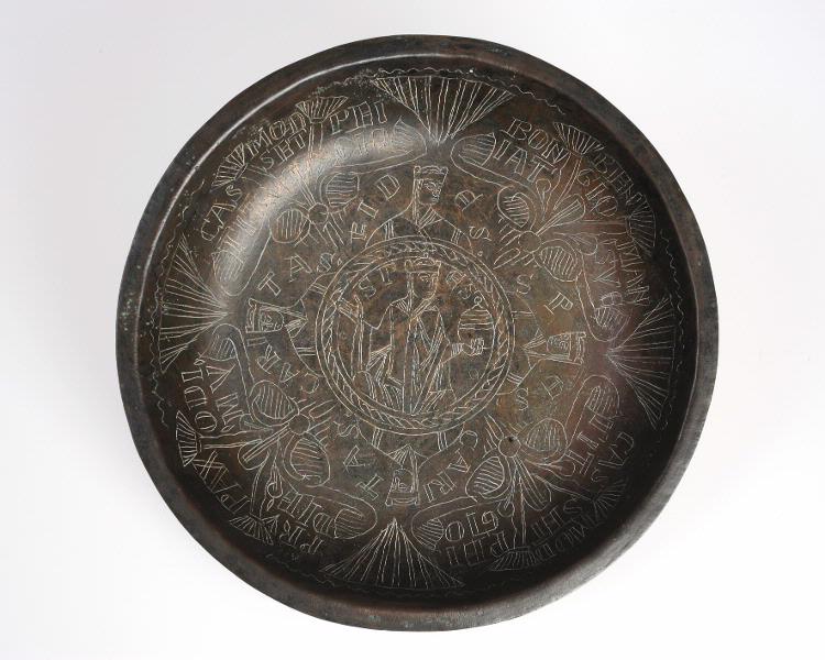 - Sköljkärl av brons, s.k. Hansaskål. 1100-talet. I mitten en graverad bild av SPES, hoppet, hållande ett bröd i ena handen. Centralbilden omslutes av FIDES, tron och CARITAS, kärleken. Omramningen av dessa kardinaldygder utgöres bl a av bladornament, bland vilka man kan läsa namnen på andra dygder och synder: CASTITAS, kyskheten, MODESTIA, måttligheten, RELIGIO, fromheten, BONITAS, godheten, BENINGITAS, välgörenheten, MANSUETUDO, saktmodet, PRUDENTIA, visheten, PAX, freden och ODIUM, hatet.
