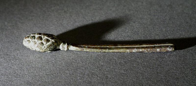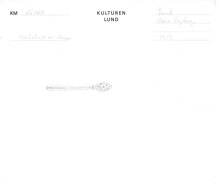 Enligt Metropolis: Skedskaft av brons. Enligt katalogkort: Skedskaft av tenn.