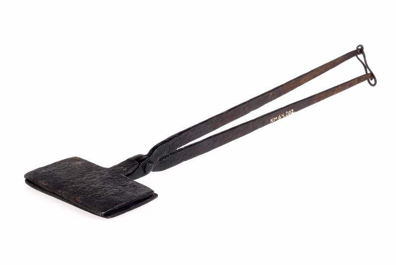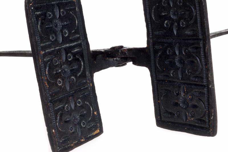 Rektangulärt, med mönster i tre fält med rosetter och bågar m.m. Skänklarna smidda i samma stycke och med sammanhållande ögla i änden.
