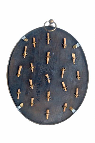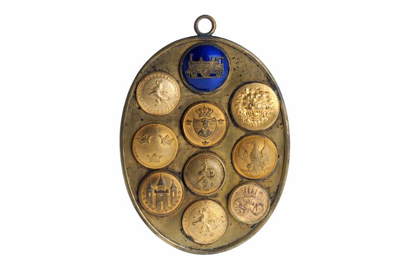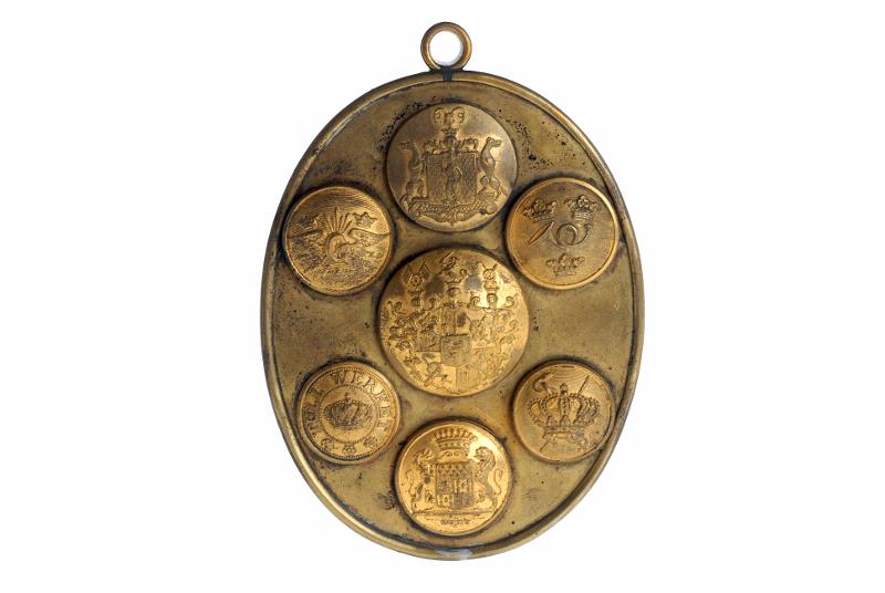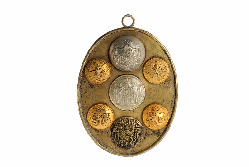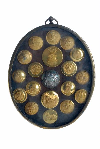 Oval på höjden, drivna och ciselerade vapenknappar.