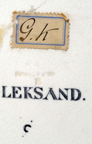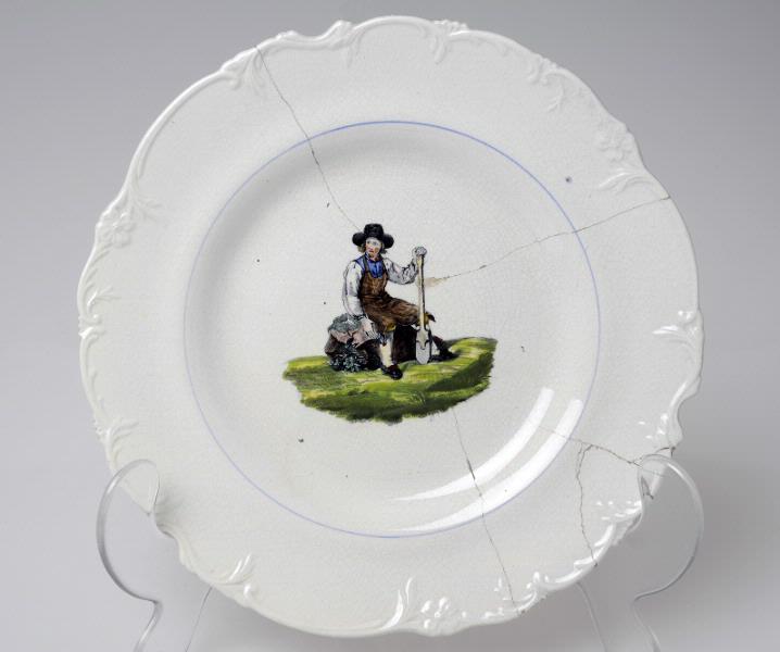 Vågigt brätte. Handkolorerad gravyr i grönt; brunt, blått, rött, svart och gult; på spegeln dalmas sittande på en stock. Mönstret tillverkat 1840-1875. Sprucken.