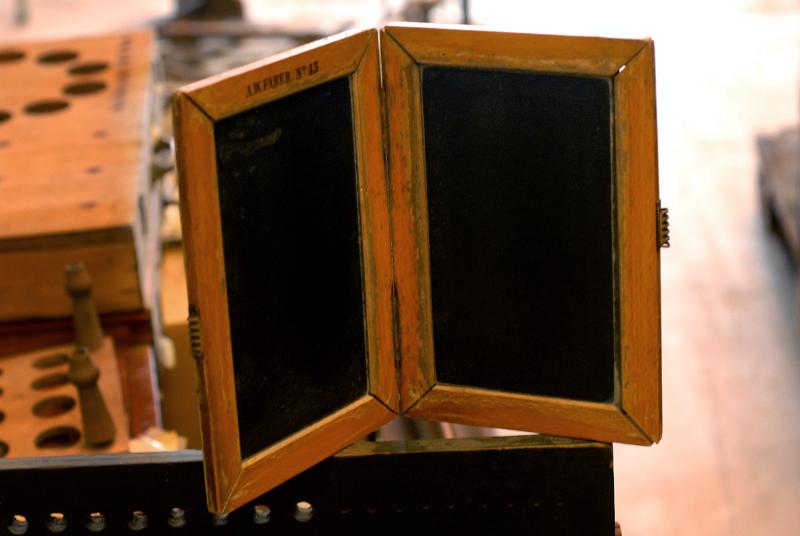 Inramade i träram. Hopfällbara. Hålls ihop med ett lås för griffeln.