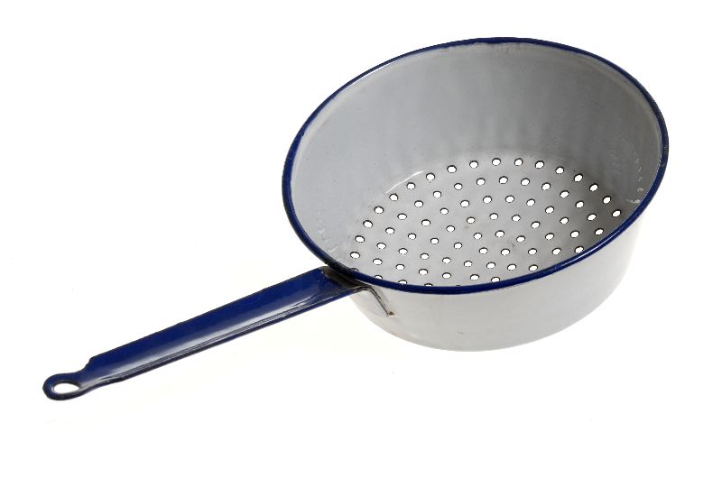 Vit, av emaljerad stålplåt, med blå rand läng kanten. Blått handtag.