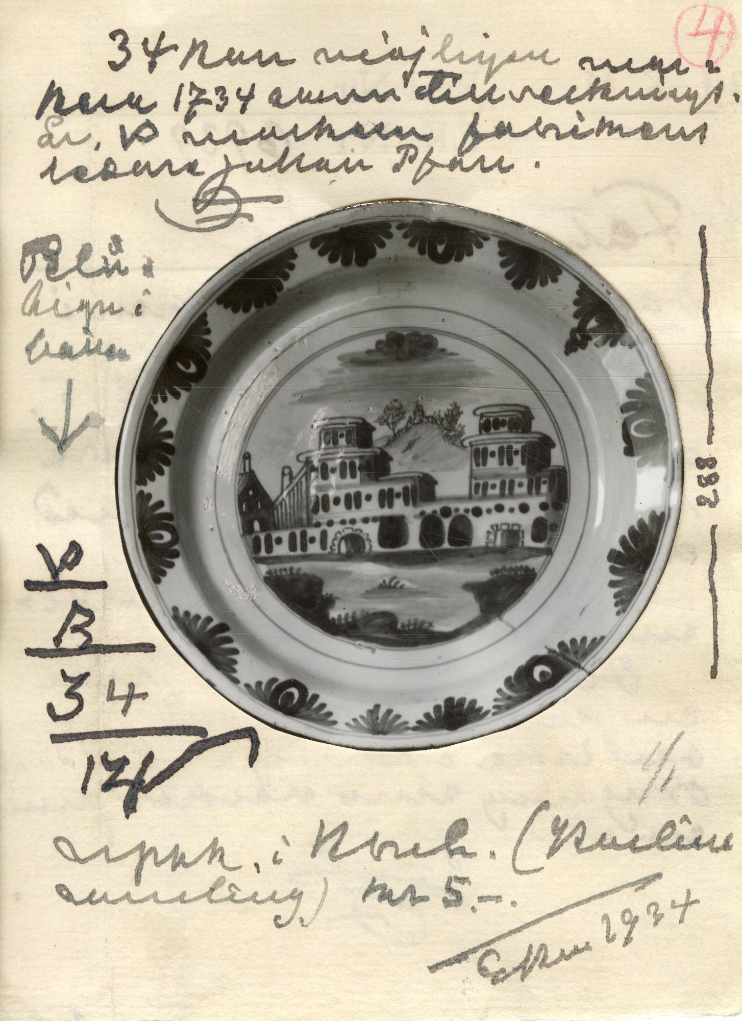 Blå dekor med upprepat mönster runt kanten. I spegeln landskap och byggnad.