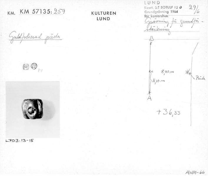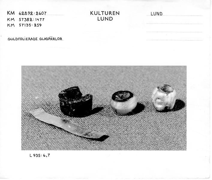 Guldfoliepärla där pärlans ytterkontur utgörs av fyra likformigt placerade vulster, vardera ornerade med en punktcirkel. 1000-talet.