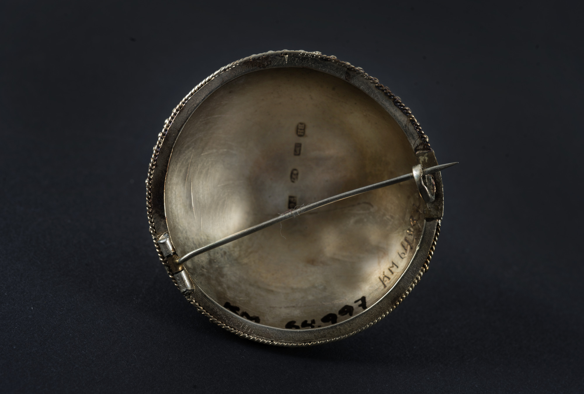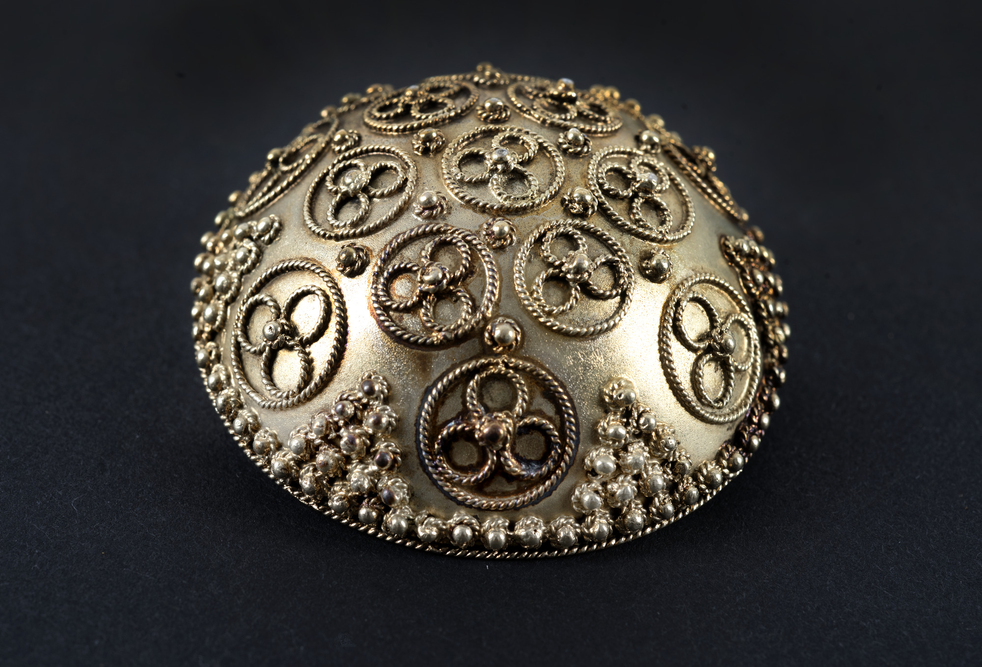 Halvsfärisk, filigran och granulering. Stämpel: 1884. Troligen import.