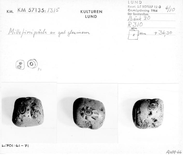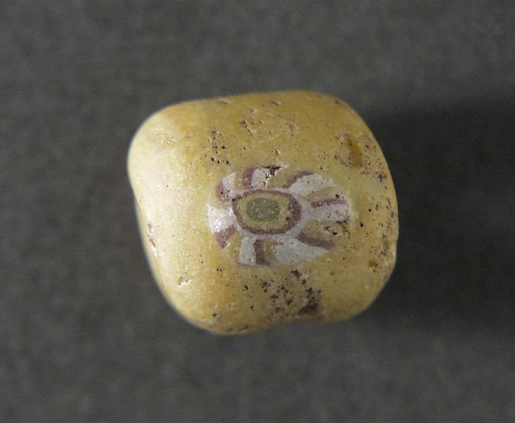 Pärla i millefioriteknik, som har olikfärgade glastrådar inlagda i en gul glasmassa.