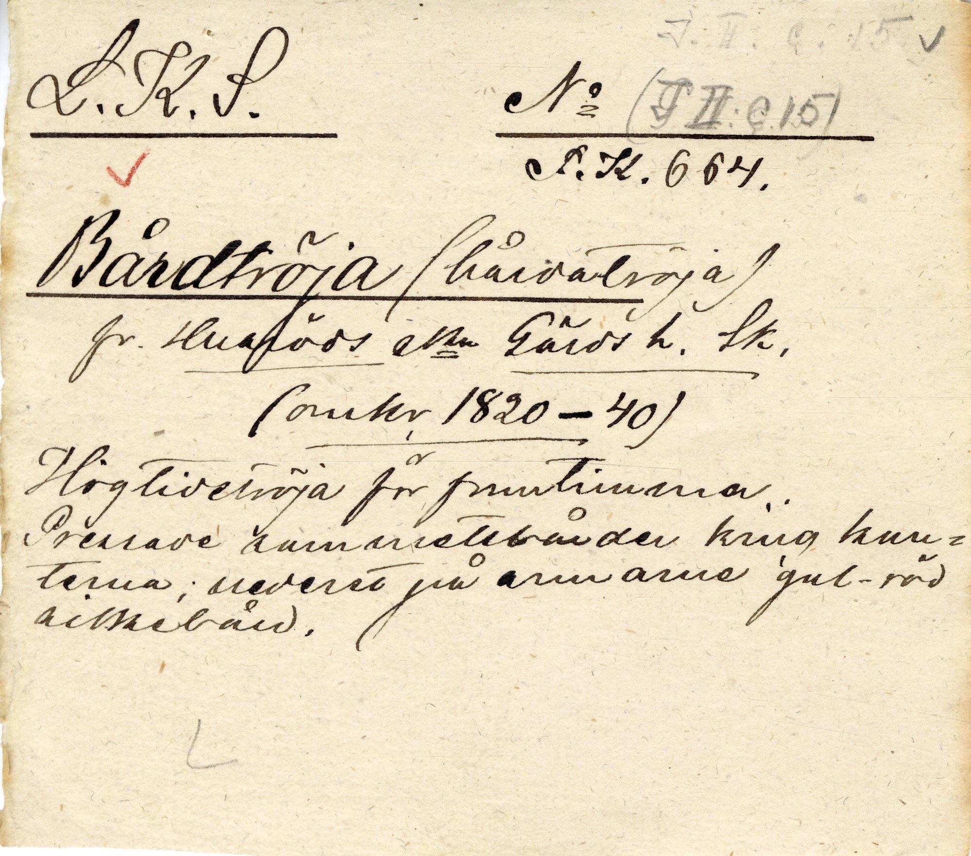 - Svart. Ståndkrage, stickad i fyra rader. På framsidan och utefter nederkanten dekorerad med ett brunsvart slätt sammetsband och ett 4,5 cm brett skuret, svart sammetsband med stiliserade blad. Ärmlinningen dekorerad med ett brunrosa sidenband, mönstervävt, omramat av brunsvarta släta sammetsband. Två vinkelformade sömmar i ryggen från ärmen till midjan. Tröjan har ett litet skört genom insatta tre kanter i midjan och två veck bak. Helknäppt med åtta par hakar och hyskor. Ärmlinningen knäppt med ett par hakar och hyskor. Fodrad med svart ylletyg. Sidenbanden vid ärmarna nästan borta. Maläten. Kemtvättmärke borttaget. Märke i sammeten efter häftklammrar sept-94.