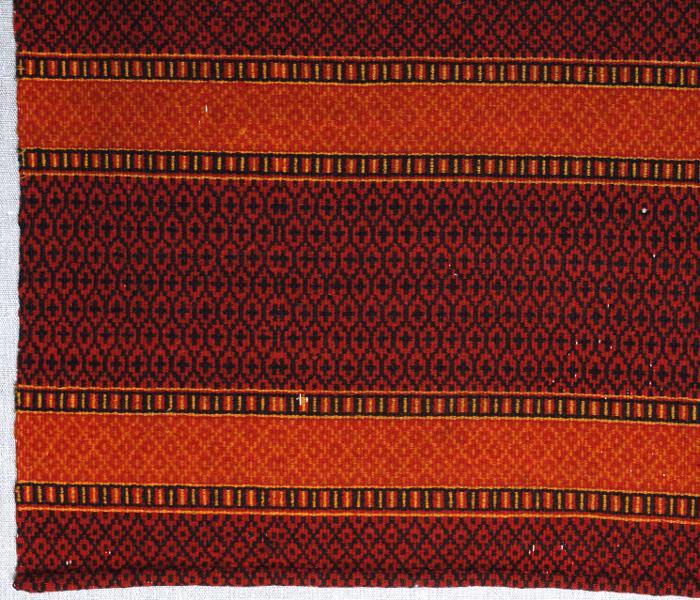 Inslag i ullgarn i rött, rödgult, svart, tvärbårder. Varp av tvinnat bomullsgarn.