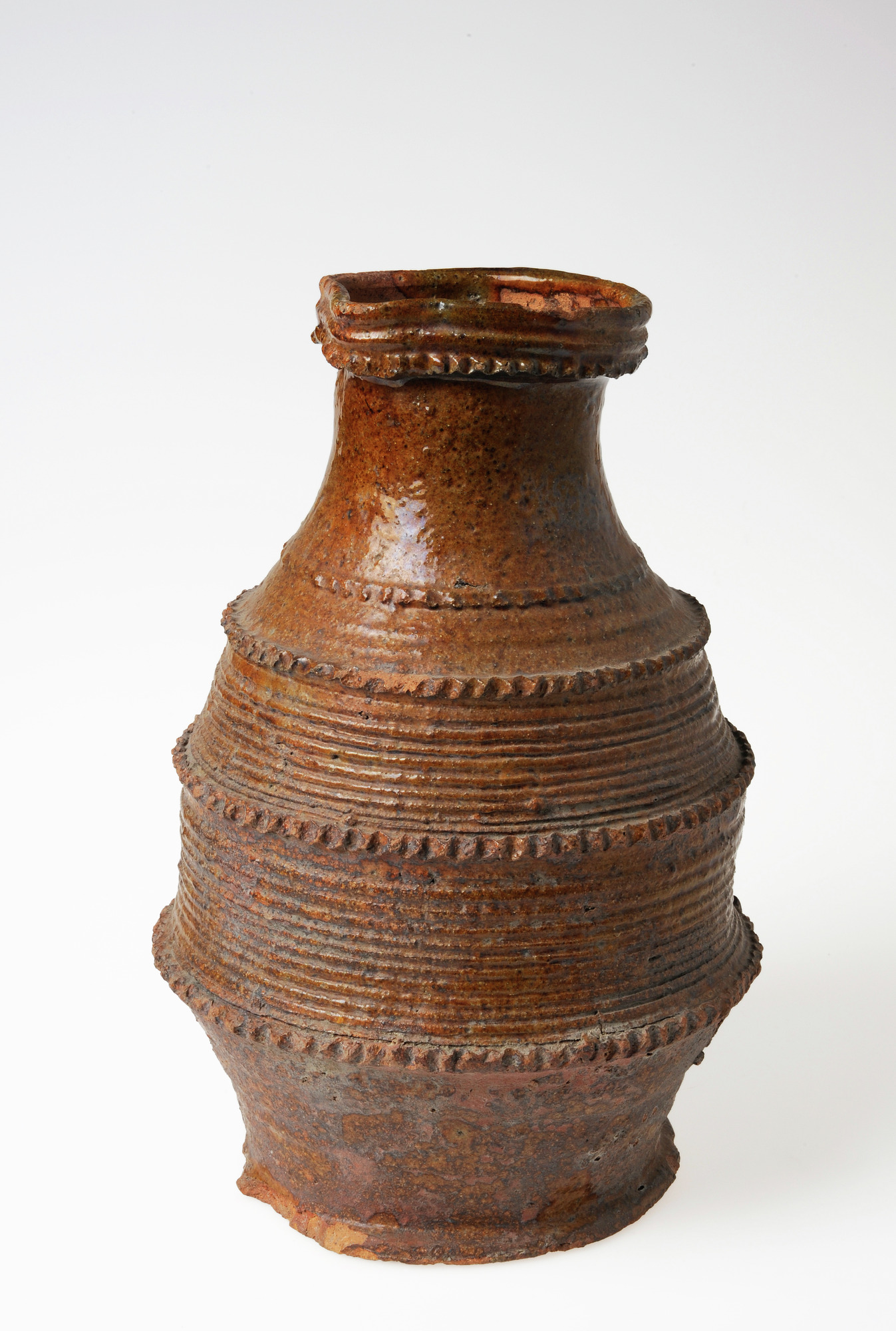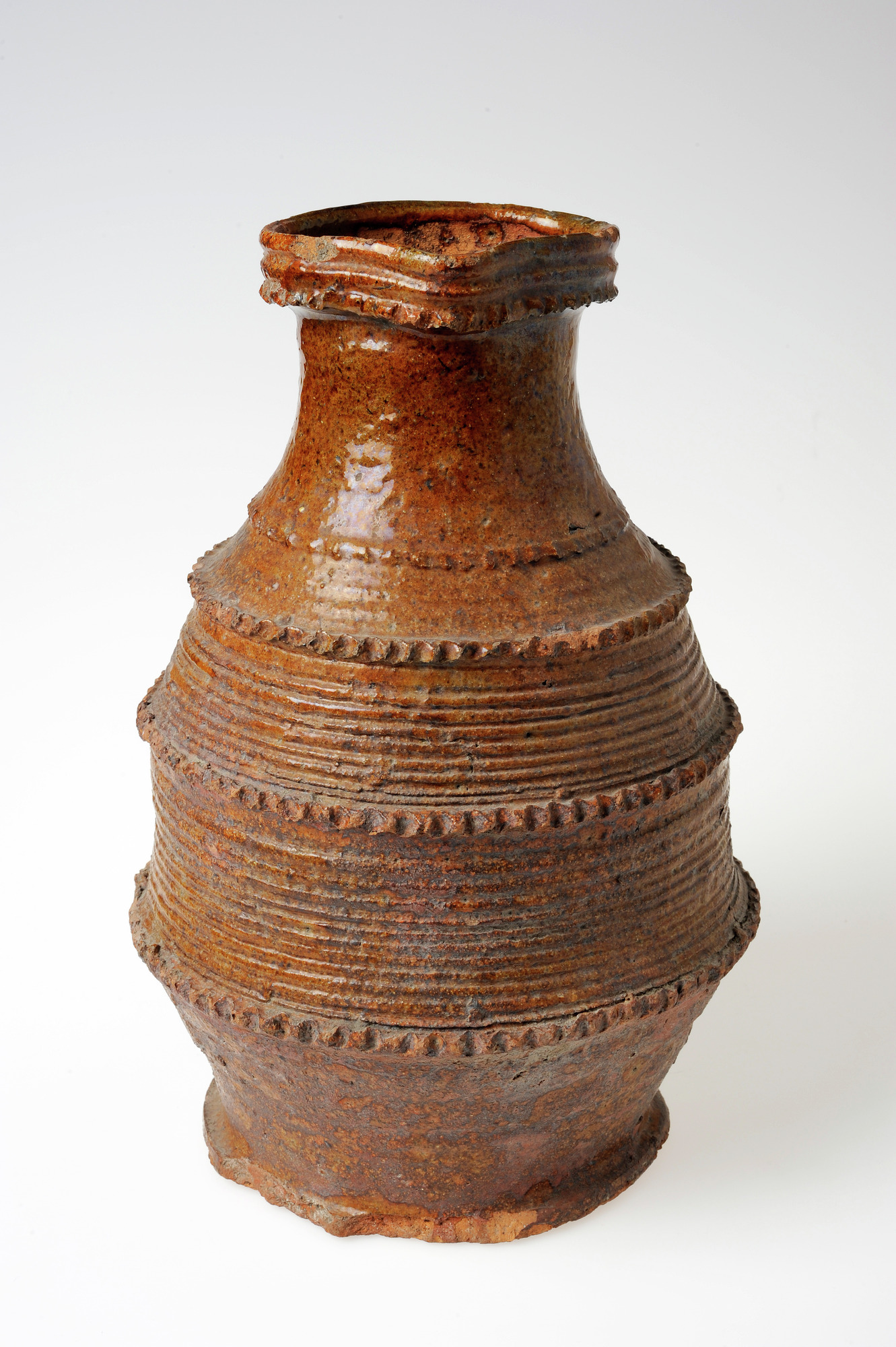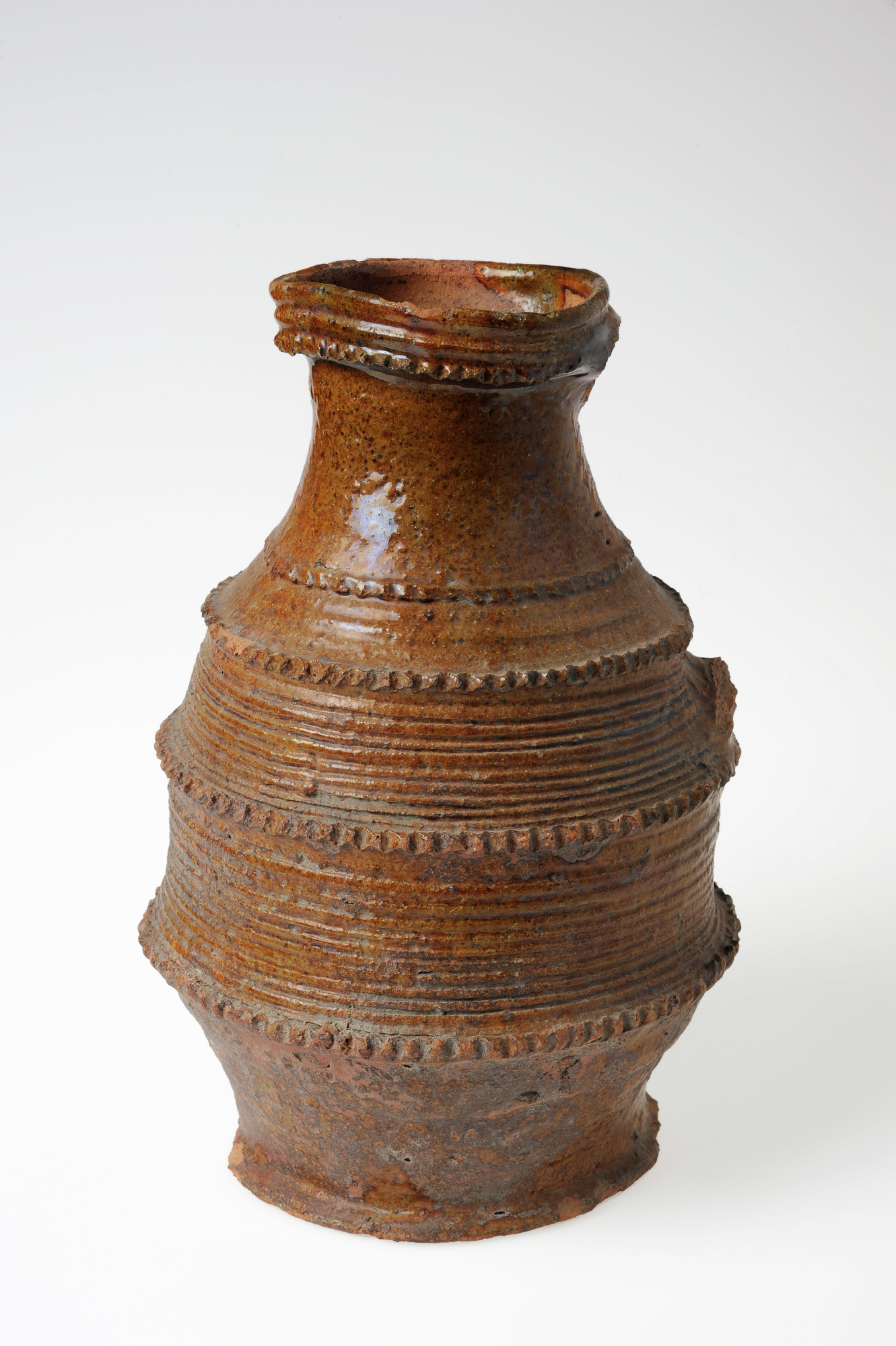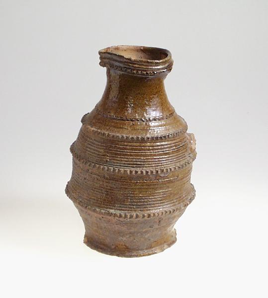 Rödgods. Utsidig blyglasyr. Hänkeln borta.