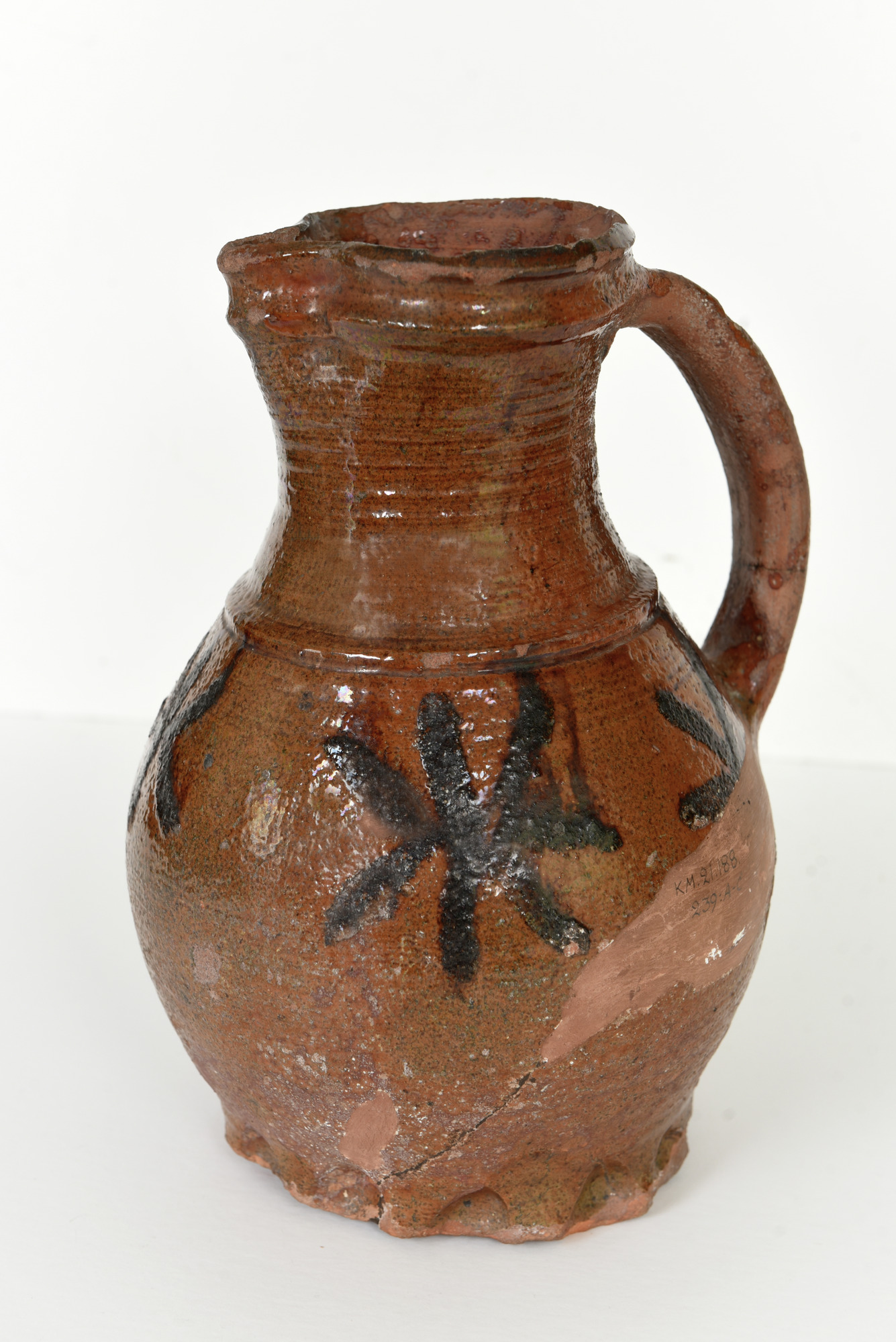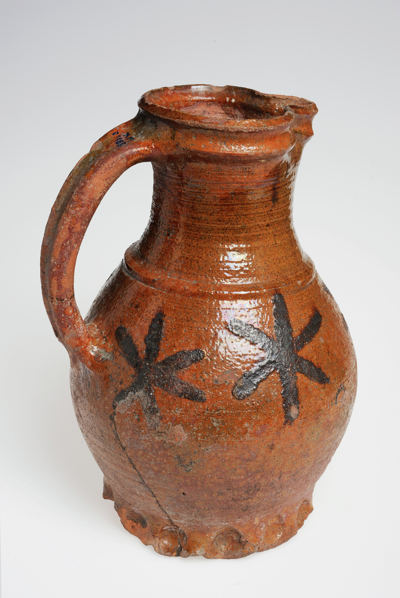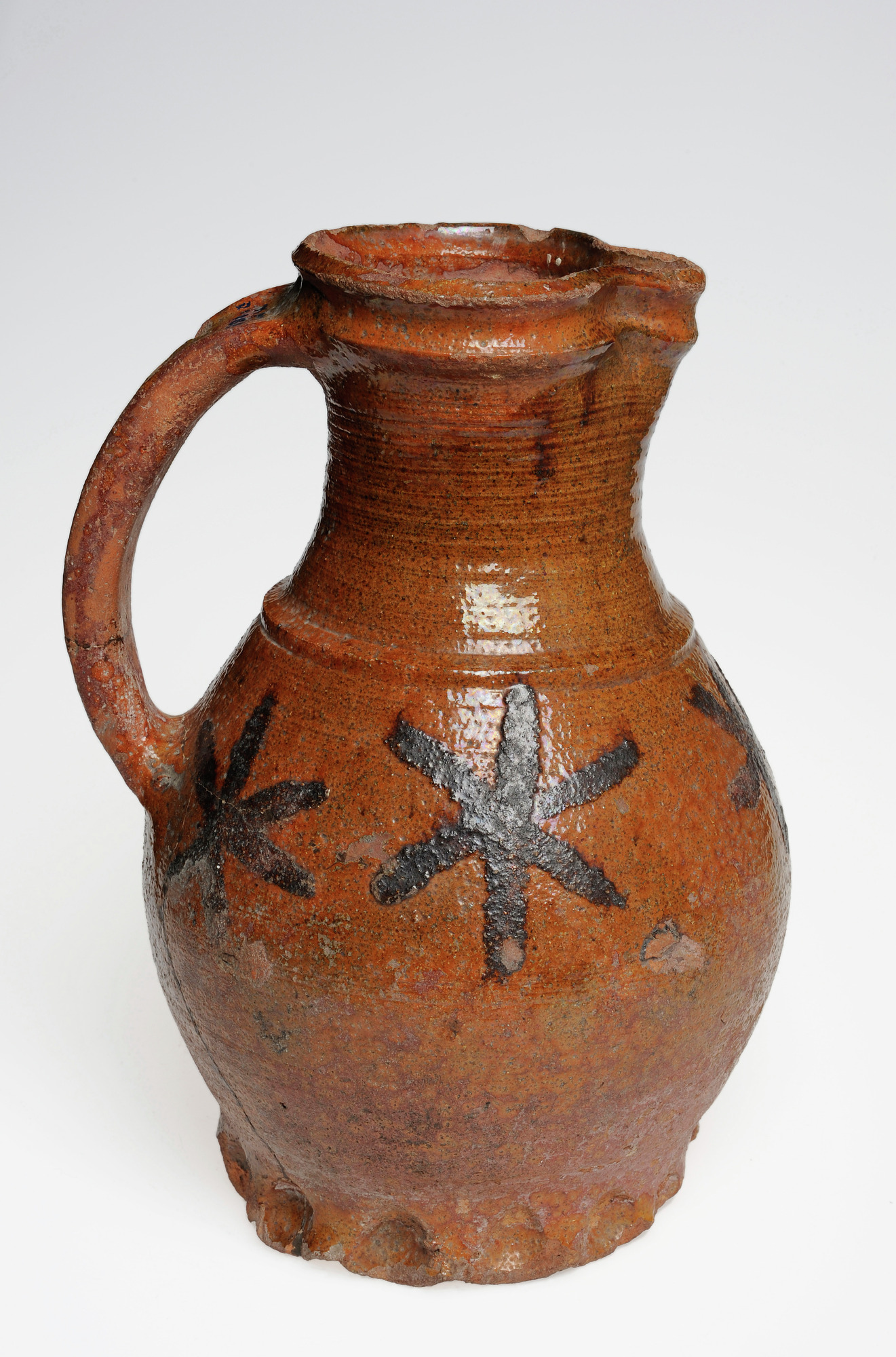 Rödbränt lergods, blyglasyr på utsidan. Mönster av mörka stjärnor i glasyren. Buktig i mitten och med ränder på ovandelen.