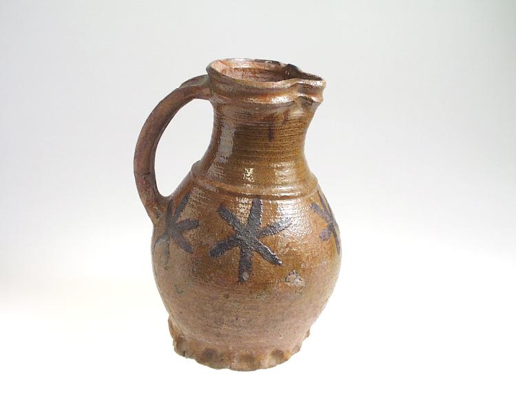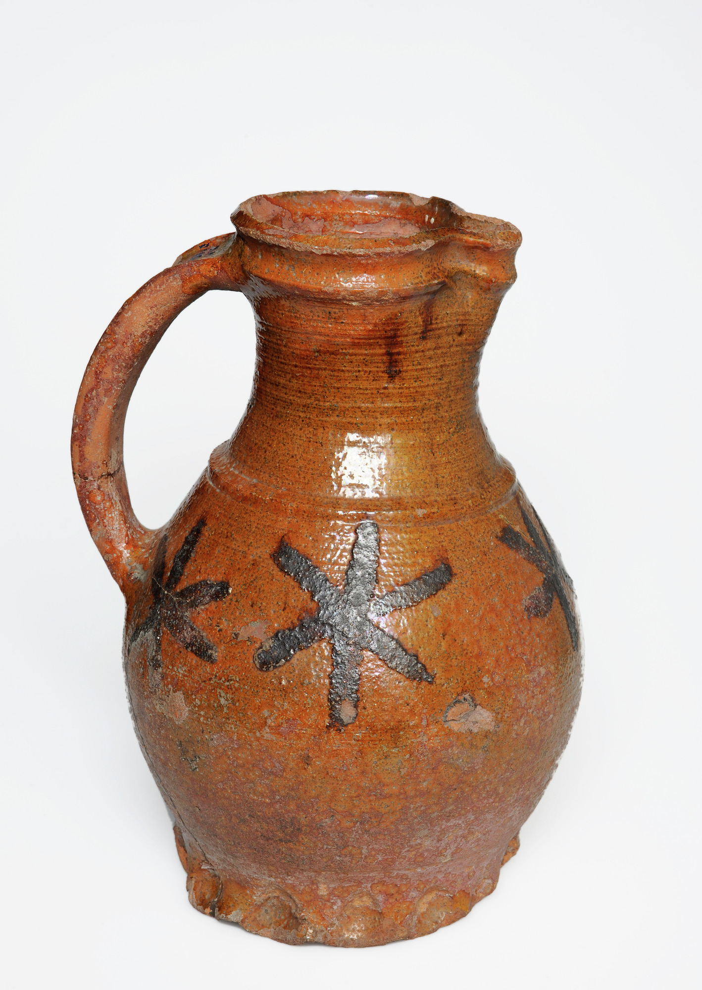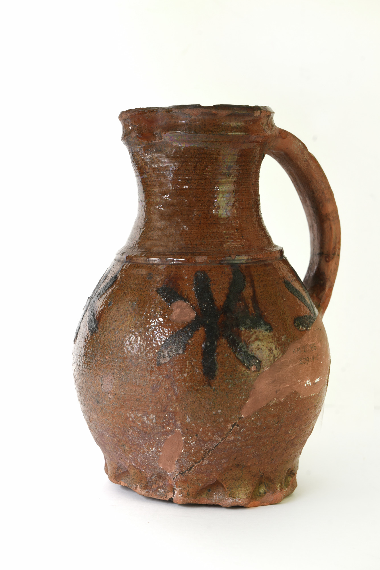 Rödbränt lergods, blyglasyr på utsidan. Mönster av mörka stjärnor i glasyren. Buktig i mitten och med ränder på ovandelen.