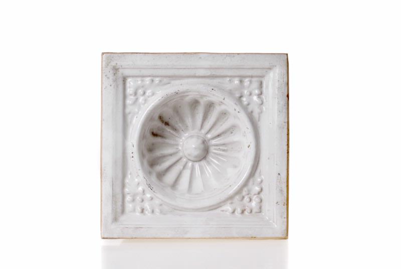 Framsidan vitglaserad med konkav nedsänkning i mitten. Lågrelief. Baksidan urgröpt.
