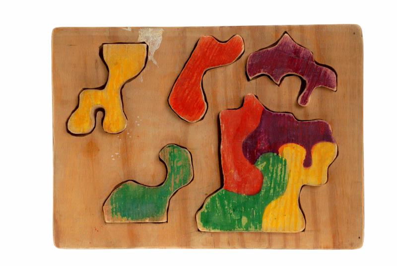 Av trä, sågat. Består av 5 oregelbundna bitar målade i gult, rött, grönt och violett. Pedagogiskt uppbyggt.