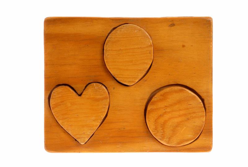 Av trä. Består av 3 bitar, en spetsoval, ett hjärta och en cirkel som skall passas in mot bakgrunden. Lackerad. Pedagogiskt uppbyggt.