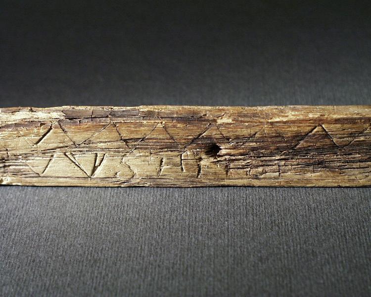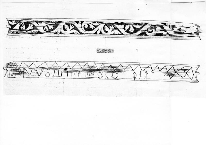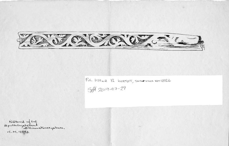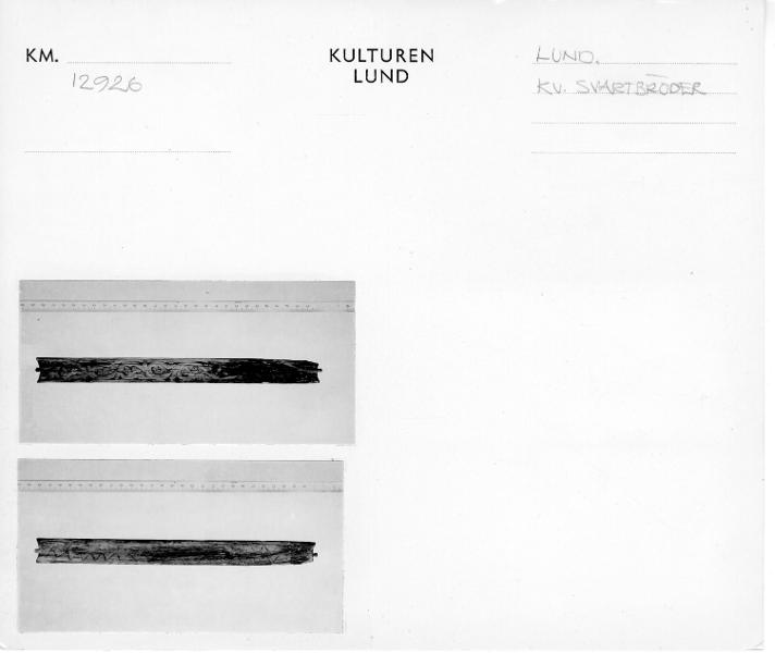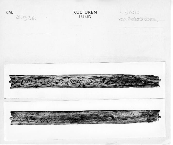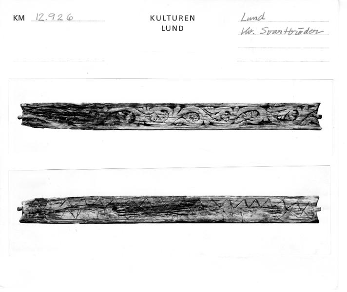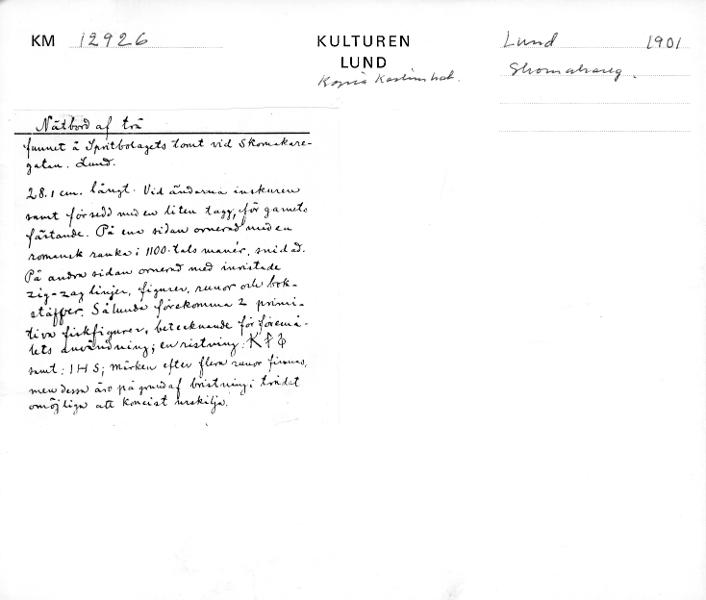 - Karlins katalogkort: Nätbord af trä, funnet å Spritbolagets tomt vid Skomakaregatan, Lund. 21,8 cm. långt. Vid ändarna inskuren samt försedd med en liten tagg, för garnets fästande. På ena sidan ornerad med en romansk ranka i 1100-talets manér, snidad. På andra sidan ornerad med inristade zig-zag linjer, figurer, runor och bokstäfver. Sålunda förekomma 2 primitiva fiskfigurer, betecknande för föremålets användning; en ristning (se bild) samt: IHS; märken efter flera runor finnas, men dessa är på grund av bristningar i trädet [sic] omöjliga att koncist urskilja.