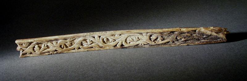 - Nätbord av trä. Vid ändarna inskuren samt försedd med en liten tagg för garnets fästande. På ena sidan finns en snidad romansk ranka i 1100-tals manér. På andra sidan ornerad med inristade zig-zag linjer, figurer (fiskar), runor och bokstäver. Publikation.