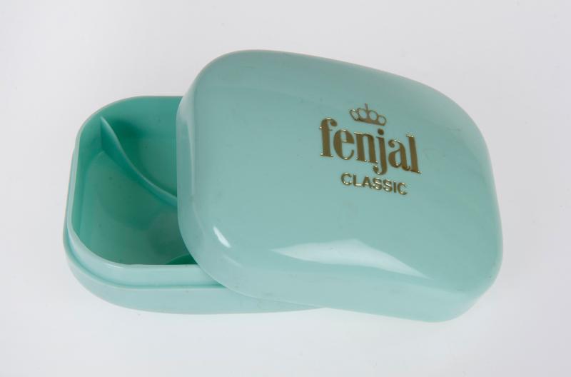 [Katalogkort saknas 19990301] Av ljust turkosblå plast; avrundat rektangulär med guldtryck: "Fenjal Classic".