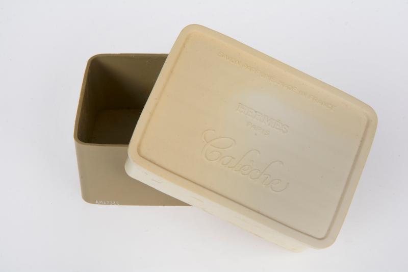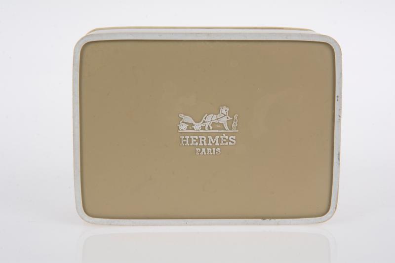 [Katalogkort saknas 19990301] Av vit och ljusbrunt plast; rektangulär med text i vitt: "Hermes Paris Calèche..".