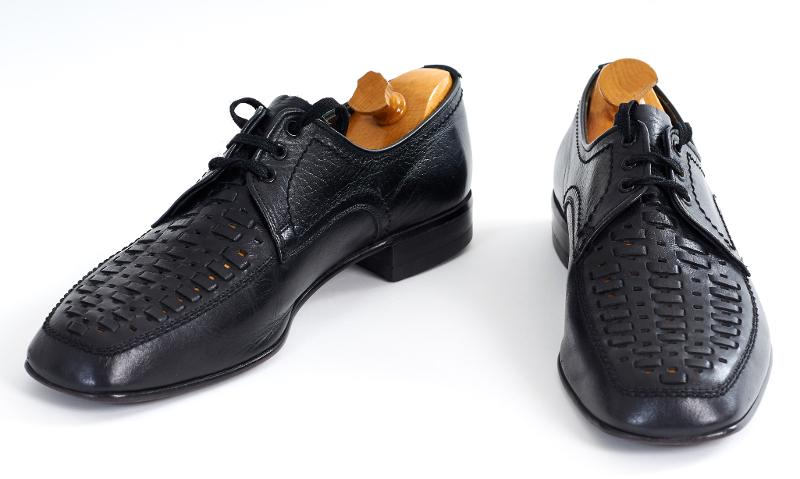 Svarta. Lädersula. Skinnfoder. Innersula av ljust skinn. I svarta skinnfodret firmastämpel med guldtext: Royal Svensk kvalitetssko. Insidan: 78/64 8 1/2 29 OH 39. Tre par snörmaljor med skoband, med celluloida spetsar. Flätad ovansida. Prydnassömmar. Baknåt. Svart syntetmaterial i klacklappen. Mått: klack H 2,5 cm, Br 6,8 cm, plösen H 19 cm. Defekter: slitna, svärtade sulor.