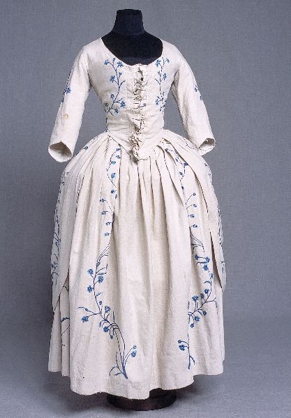 Bestående av robe och kjol. Beige halvlinne med schattersömsbroderier i vitt, ljusblått och mörkblått bomullsgarn. I roben ett insytt foderliv av gråvitt linne, vilket snöras samman framtill. Kjolen har runt omkring i nederkanten en skoning av kyprat linne, ungefär 5 cm bred. Halvlång isydd ärm, fodrad med vitt linne. Roben har framtill en veckad garneringsremsa av tyget. 2 st klädda knappar baktill, omkring 10 cm nedanför midjan.