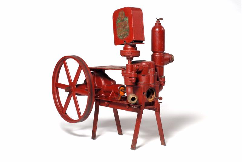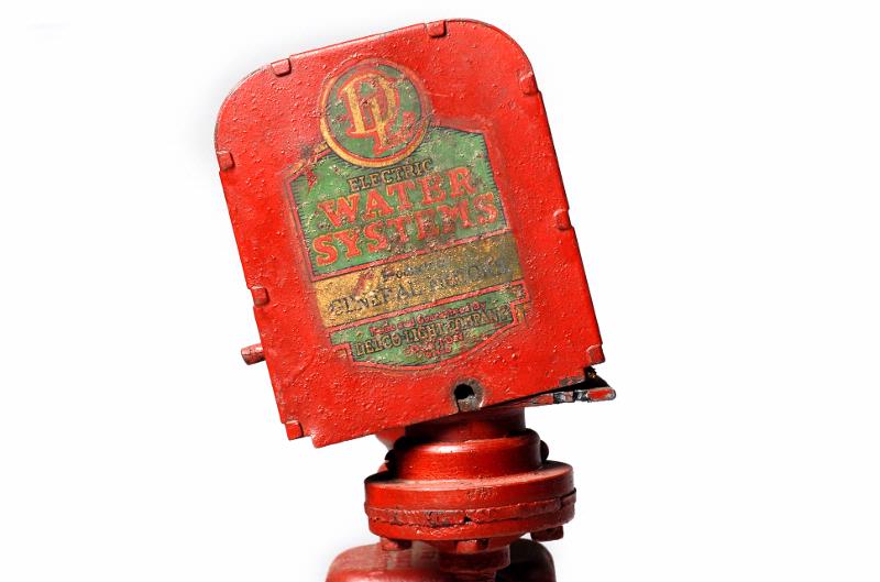 Röd. "Electric Water Systems produced by General Motors", kolvpump för drivning med elmotor (nu borta) med tryckbehållare och startrelä. Delvis defekt.