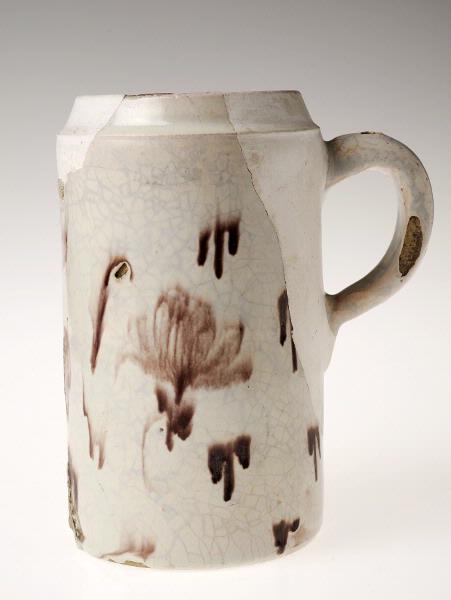 Manganfärgad blomsterdekor, kraftigt runnen i bränningen. Krakelerad glasyr. Delvis sammanbränd med annat föremål. Hanken utgör en helt fristående skärva.