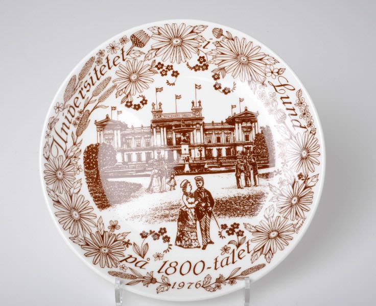 - Brun tryckt dekor; vy över Lunds Universitet på 1800-talet. Text på baksidan: Lundatallrik 1976 Detta är Gustavbergs lundatallrik nr 5. Den föreställer Universitetet i Lund på 1800 -talet. Motivet är utfört av konstnären Sven Jonsson efter gammalt vykort och gjord i benporslin, en Gustavbergsspecialitet. Upplagan är begränsad.