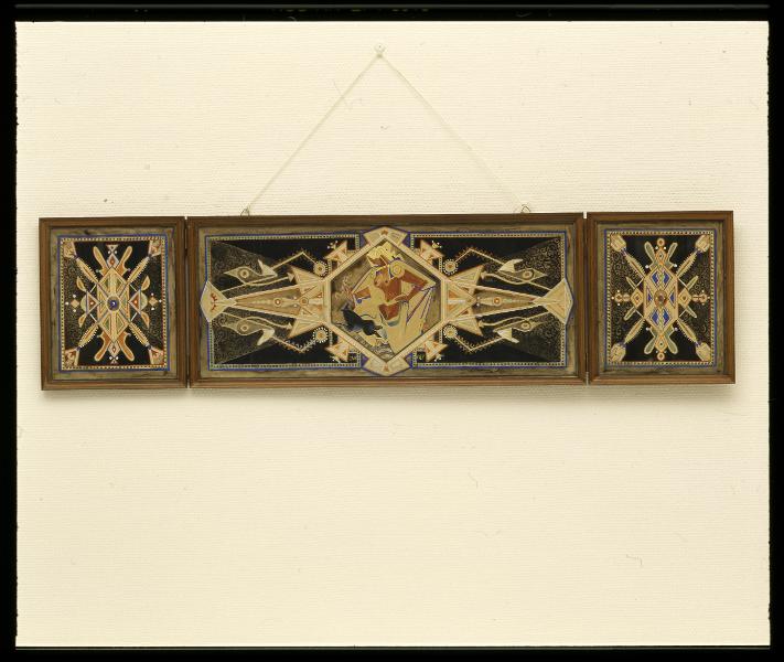 Skiss till galsmålning ? I mitten en kvinna innefattad i en sexkantig linje. Sidostyckena abstrakt dekorativa med olika mönster. Mittstyckets H 25 cm, B 61 cm.