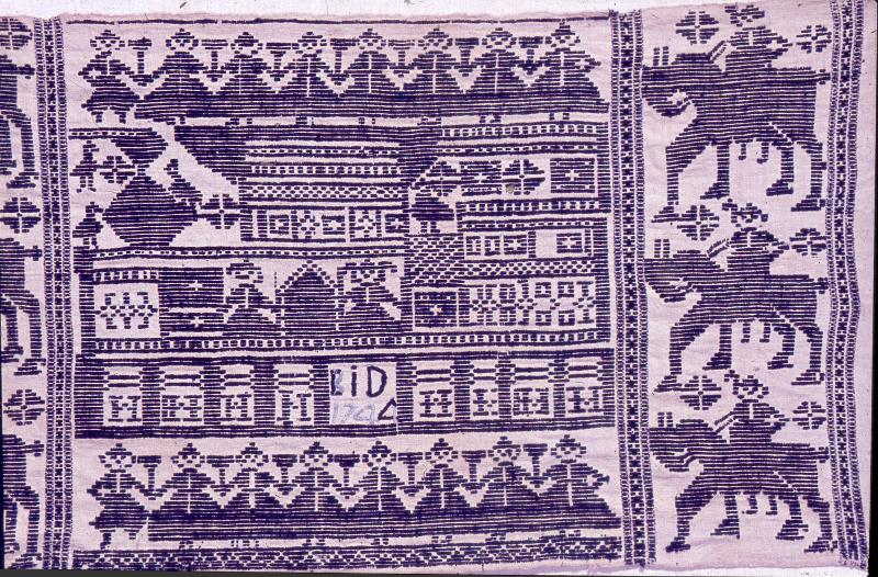 - Består av 2 längder, ej ihopsydda. Botten vit och mönster i mörkblått. Sex mönsterpartier: 1/små lejon i åttkanter 2/två stora lejon 3/två stora stjärnor 4/hjort i rundel 5/snedrutor m fåglar 6/slott och ryttare.