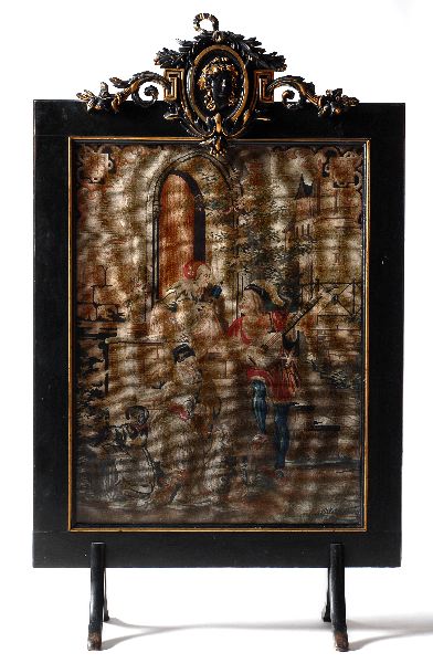 Musicerande trio (renässans pastisch) vid murparti i stad. Ram i svart och guld med, krönt med oval och ornament. På fyra fötter.