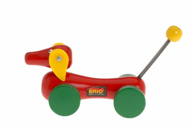 Röd, på gröna hjul. Med gula öron som svänger och vippande svans av metallfjäder avslutad med gul träkula. Förvaras i originalkartong, 12x6,5x5 cm.