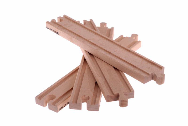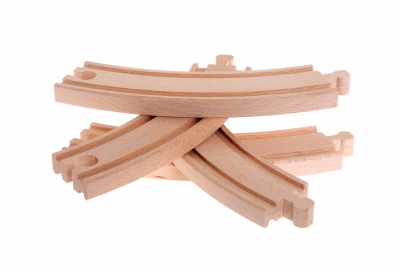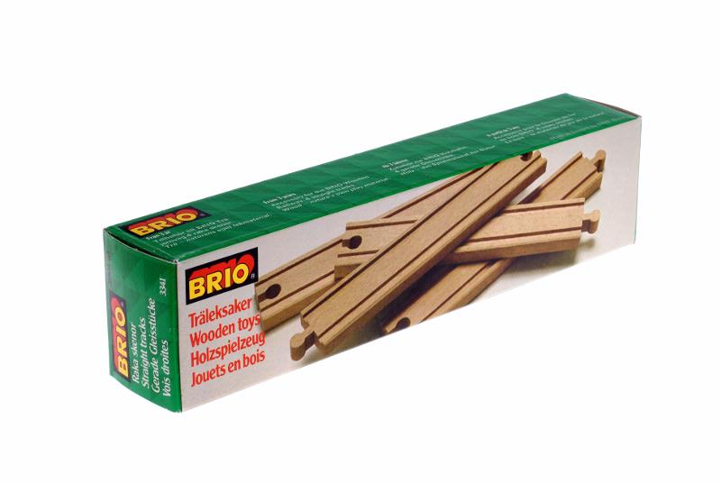 Två förpackningar, med fyra stycken raka och fyra stycken svängda skenor av obehandlad bok, för Brio järnväg.