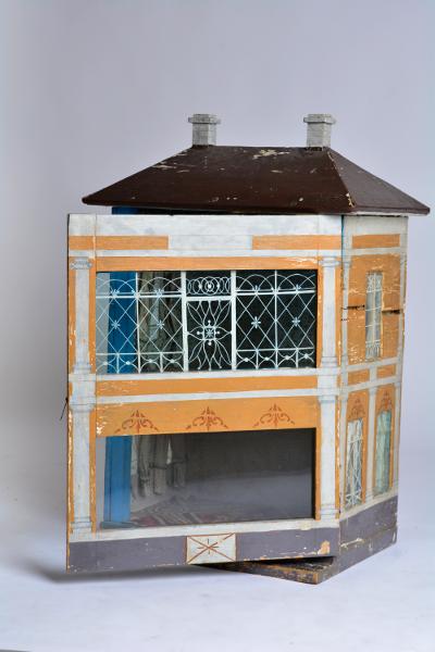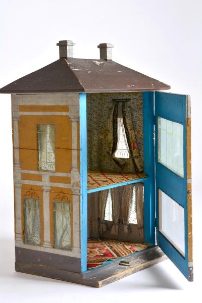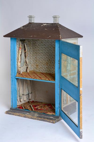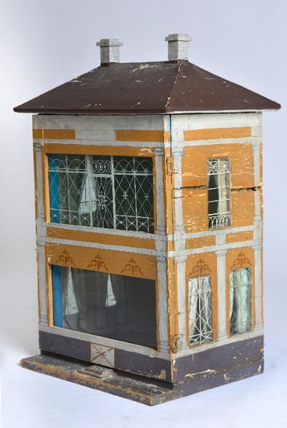 Dockskåpet "San Souci". Av trä, i 2 våningar med 1 rum i varje, brutet tak med 2 skorstenar, målad fasad i gulockra med gråvita kolonner, grå sockel, brunt tak. Framsidan går att öppna. Bottenvåning: bit av mönstrad 1800-talsmatta på golvet, tapet av småmönstrad tryckt bomull, dito gardiner. Övervåning: beige grov väv av panamatyp broderad med röd korssöm på golvet, tapet av småmönstrad tryckt bomull, gardin av stormönstrad tryckt bomull med spetsar.