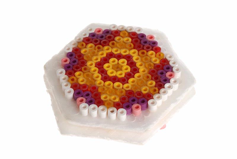 Fyra s.k. terapiarbeten, av ihopfogade "indianpärlor" av plast, tillverkade på daghem, bestående av: en sexkantig vit cellplastbricka med pärlor i stjärnmönster i gult, lila, rött, vitt och rosa. Mått: B 8,6 cm. En sexkantig vit cellplastbricka med pärlor i stjärnmönster i gult, rött, vitt och rosa. Mått: B 8,6 cm. Undertill ristat i cellplasten: "EMMA". En rektangulär platta, utan cellplast; pärlorna ihopsvetsade med hjälp av strykjärn. Av pärlor i rosa, vitt, blått, orange, rött, grönt, brunt, lila och svart. Mått: L 4 cm, B 3 cm. En blomma med stjälk och blad, utan cellplast; pärlorna ihopsvetsade med hjälp av strykjärn. Av pärlor i gult, rött och grönt. Mått: H 3,5 cm, B 2,2 cm. Skador: ett antal pärlor har lossnat och saknas, alla pärlarbetena utom blomman har blivit ihopklistrade och går ej att dela på. Vårdåtgärder: rengjorda med pensel.