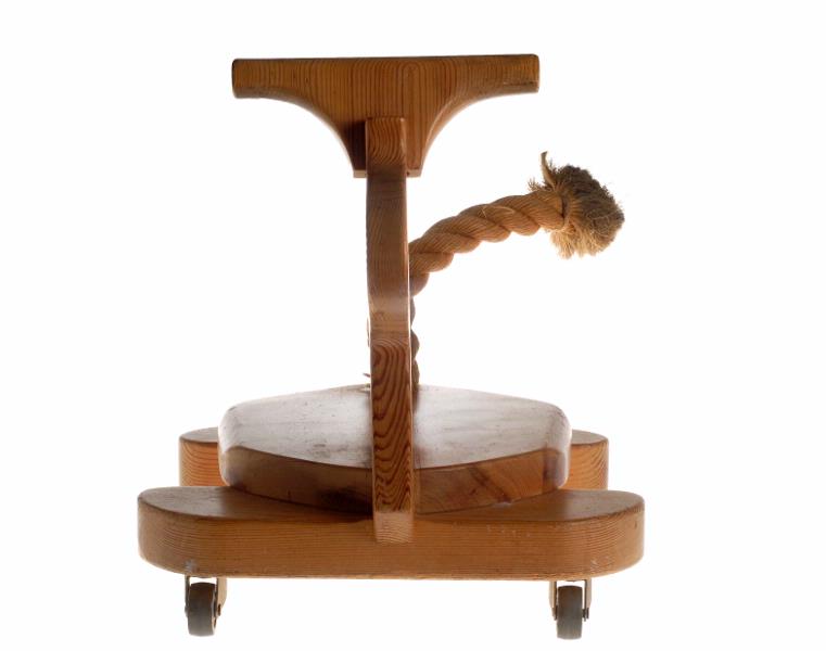 - Av fur. Till formen en häst(?) som står på fyra hjul. Sexkantig sittbräda, under denna två tvärställda träribbor vid vilka hjulen är fästa. Hjul av metall med gummiskoning. På huvudet ett handgrepp. Till svans en tjock tross, flätad med tofs. Halsen sitter aningen löst. Vårdåtgärder: rengjord med pensel och dammtrasa.