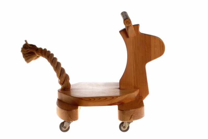 - Av fur. Till formen en häst(?) som står på fyra hjul. Sexkantig sittbräda, under denna två tvärställda träribbor vid vilka hjulen är fästa. Hjul av metall med gummiskoning. På huvudet ett handgrepp. Till svans en tjock tross, flätad med tofs. Halsen sitter aningen löst. Vårdåtgärder: rengjord med pensel och dammtrasa.