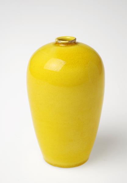 Rund bukig med trång mynning och svagt markerad mynningsrand. Kärlets har största vidd upptill och avsmalnar mjukt ner mot botten. Monokrom glasyr, s.k. kejserlig gul. På ena vasen ett flertal glasyrblåsor, på andra liten nagg vid mynningen.