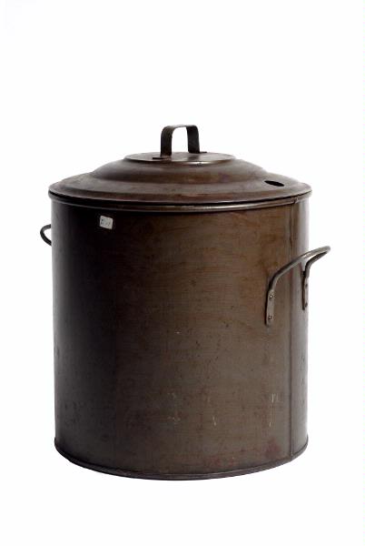 Cylindrisk behållare med insats för glasburkar och lock med hål för termometer. Något rostig. Nitade handtag.