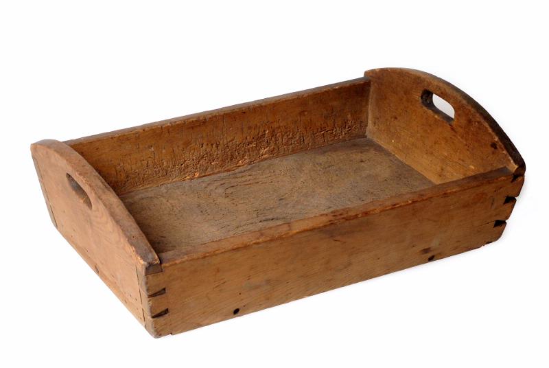 Rektangulärt med handtagshål i kortsidorna. Mycket slitet, enstaka maskhål.