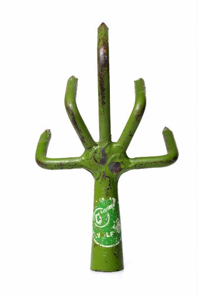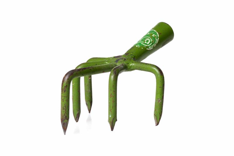 Grönmålad, med fem tänder. Skaftholk, utan skaft. Oanvänd.