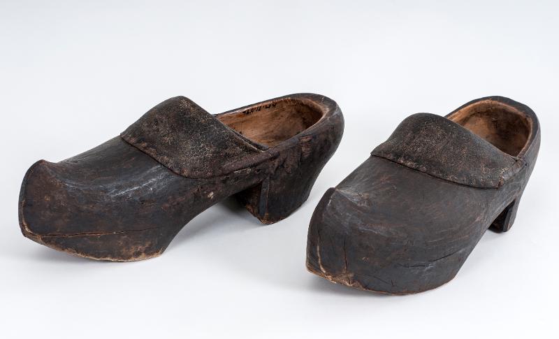 Så kallade pudeträskor, av al. Svarta med vristdynor av svart läder. Påspikade med metallbeslag på sidorna. Brunt skinn på insidan. Osulade. Mått: bak: H 9 cm, klack: H 2 cm, Br 9 cm, vristen: H 12 cm.