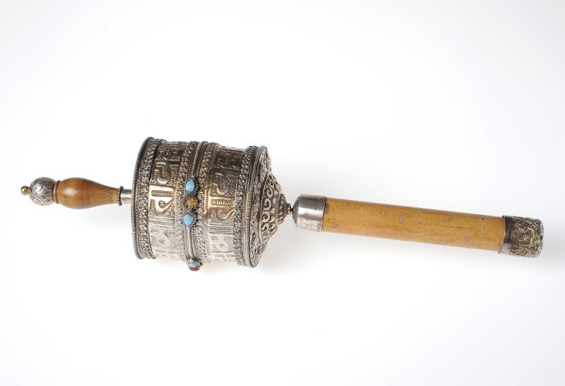 Cylinderformad dosa av silver gjord av ett hamrat band. Löstagbart lock och botten. Cicelerad dekor med skrivtecken. Dosan sitter på en metallaxel, löst snurrande och med skaft och knopp av trä med silverbeslag. På dosans isatta stenar i rött, turkos och blått i tre grupper. Smala hårt rullade pappersremsor utan text fyller hela dosan.