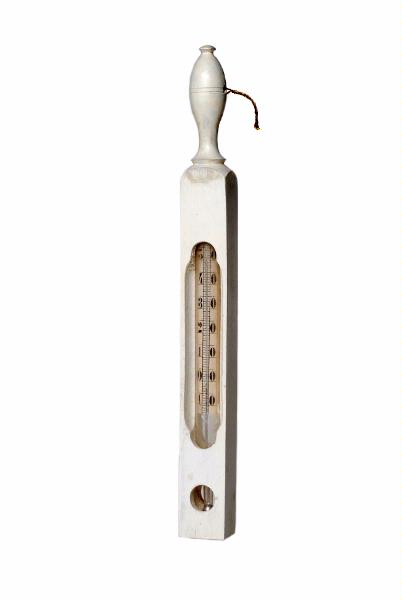 Avlång, med knopp som handtag. Vitmålad. Med kork inpluggad. Kvicksilvertermometer.