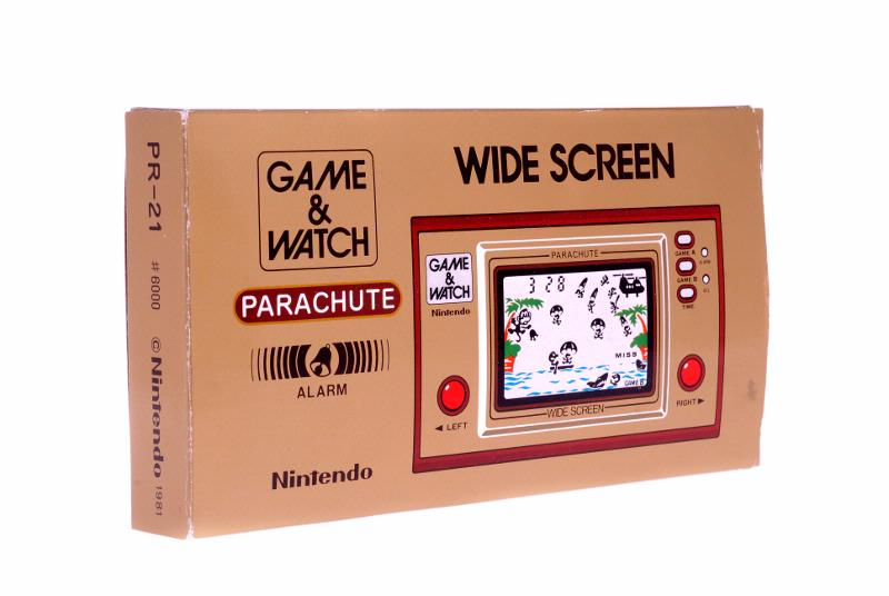 - Dataspel. Batterierdrivet. Till formen rektangulärt och platt, med centrerad bildruta, en knapp för vänster och en för höger rörelseriktning. Panelen är guldfärgad med bruna lister, baksidan av brun plast. Spelet går ut på att fallskärmar faller ner från en helikopter och landar ömsom i havet, ömsom i en båt. Förvaras i originalkartong, med utdragbar frigolitask, av plastat papper, guldfärgad med bild på aktiverad bildruta. Bruksanvisning, garantisedel m.m. finns i kartongen. Kartongen är på insidan märkt med stämplat (serie?)nummer: "00111803", och på utsidans ena kant en vit prislapp: "169.00". Vårdåtgärder: rengjort med pensel.