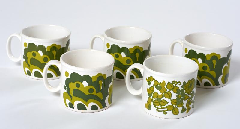 Vit, tryckt mönster i grönt. En mugg med avvikande mönster.