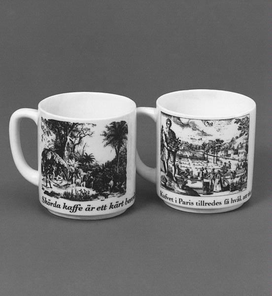 Cylindriska med svart tryckt dekor samt textband. Ursprungligen 6 muggar med olika motiv.