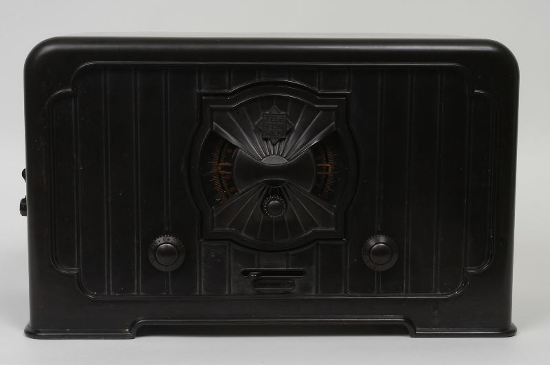 Radioapparat med lös högtalare. Radion av mörkbrun bakelit, rörlig instäl-lningsskala och fast visare. Anslutningsurtag för högtalare och skivspelare. Högtalare, fodral av ljus ekfanér.