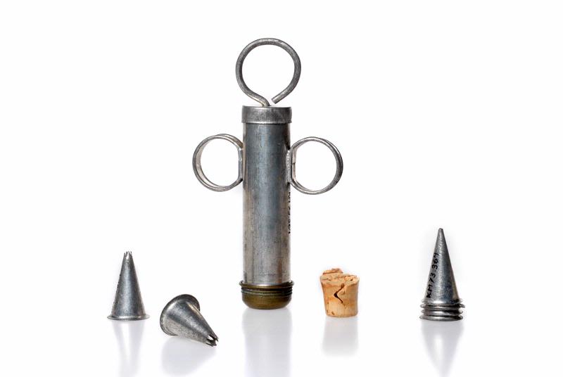 Cylindrisk med två öglehandtag. Sex utbytbara koniska munstycken. Insats med ögla. Yttre fästet. munstycken i mässing (tillhör ej ?) l (med skaft och utan munstycke): 14,8 cm. br (inkl. öglehandtag): 8,5 cm.